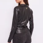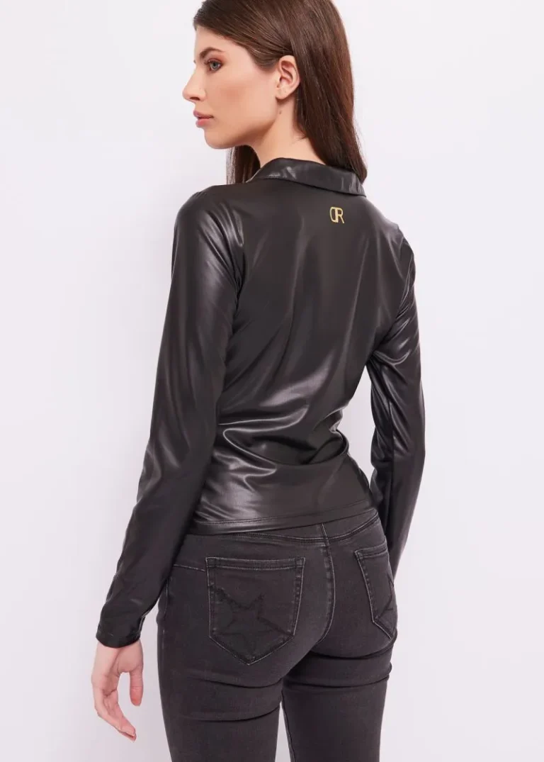Camisa en tejido de ecopiel con fruncido central y cierre con botonadura central.