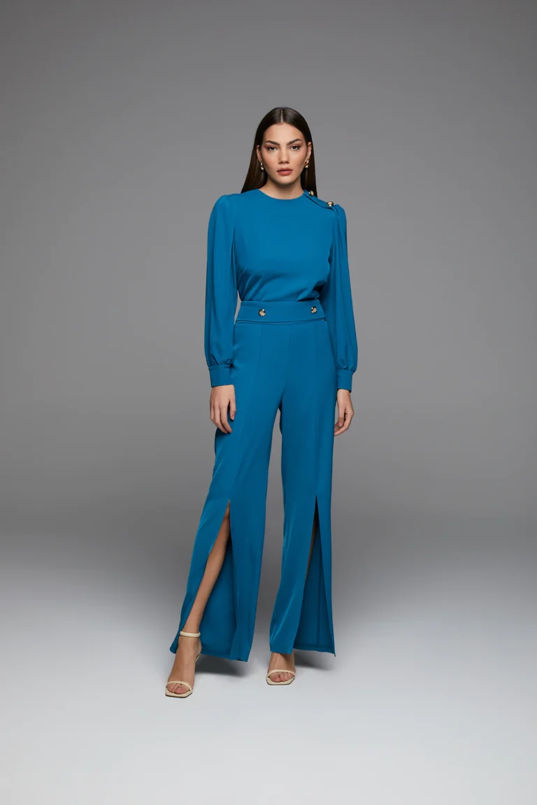 Conjunto en tejido gasa con mínimo elastano con parte superior ablusada y pantalón con tiro alto