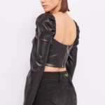 Top en tejido eco piel con corte crop y ballenas decorativas. Manga globo. Estilo corsé.