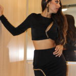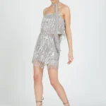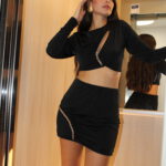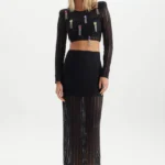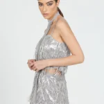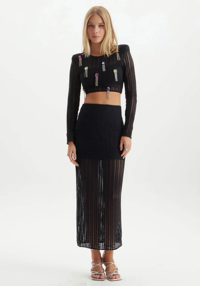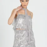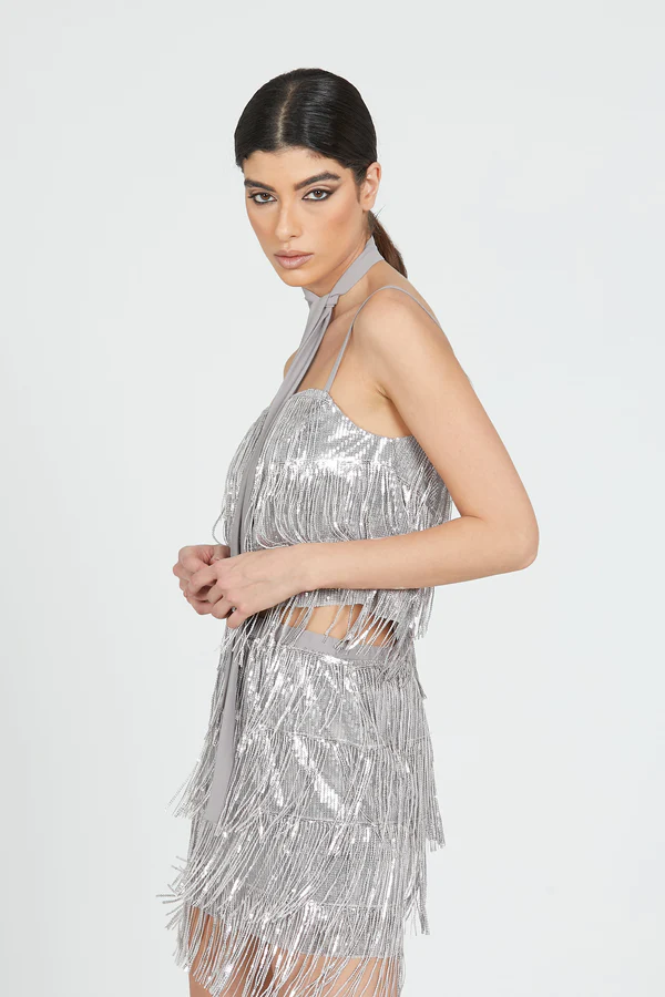 Conjunto en tejido crepe con elastano con corte crop en top y falda en tiro alto con flecos decorativos en bajo.