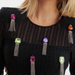 Top en tejido punto perforado con cadenas decorativas frontales.