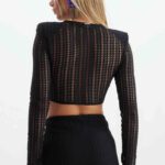 Top en tejido crepe en punto interior y malla en flecos exterior con corte crop y lazada decorativa.