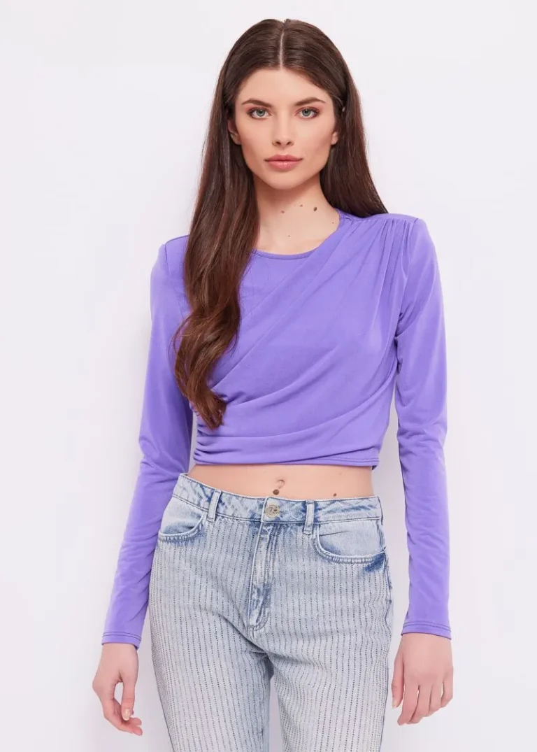 Camiseta en tejido de punto con frunce en el pecho y detalles decorativos en el mismo.