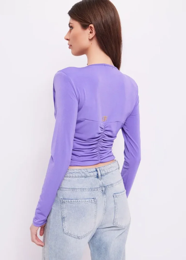 Camiseta en tejido de viscosa con elastano, anilla decorativa en la zona central, mangas anchas con rizo en el puño.