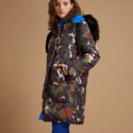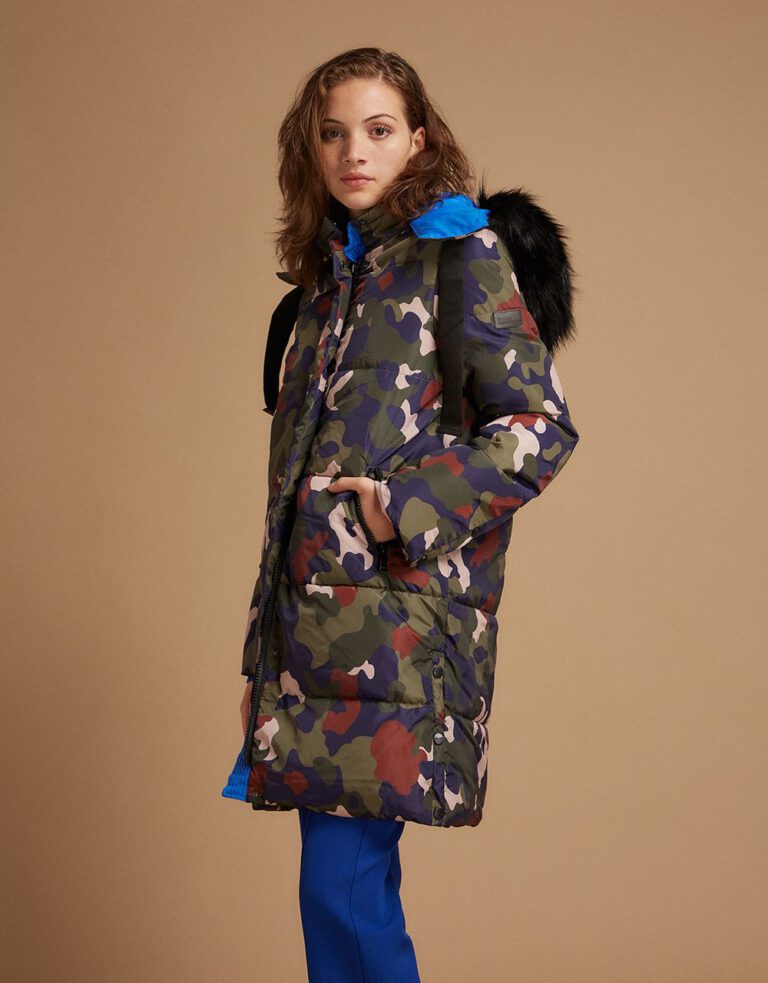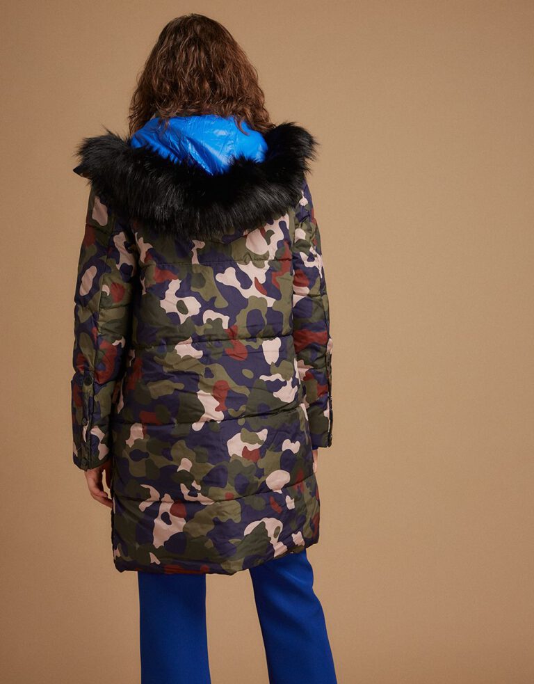 Chaquetón en corte 3/4 con estampación estilo militar, cuello con pelo sintético en color negro. Bolsillos laterales con cierre en cremallera vista.