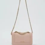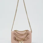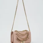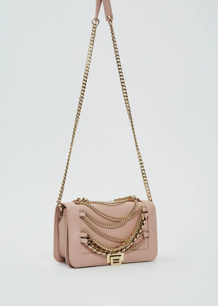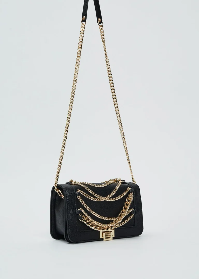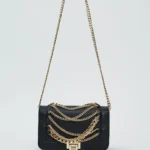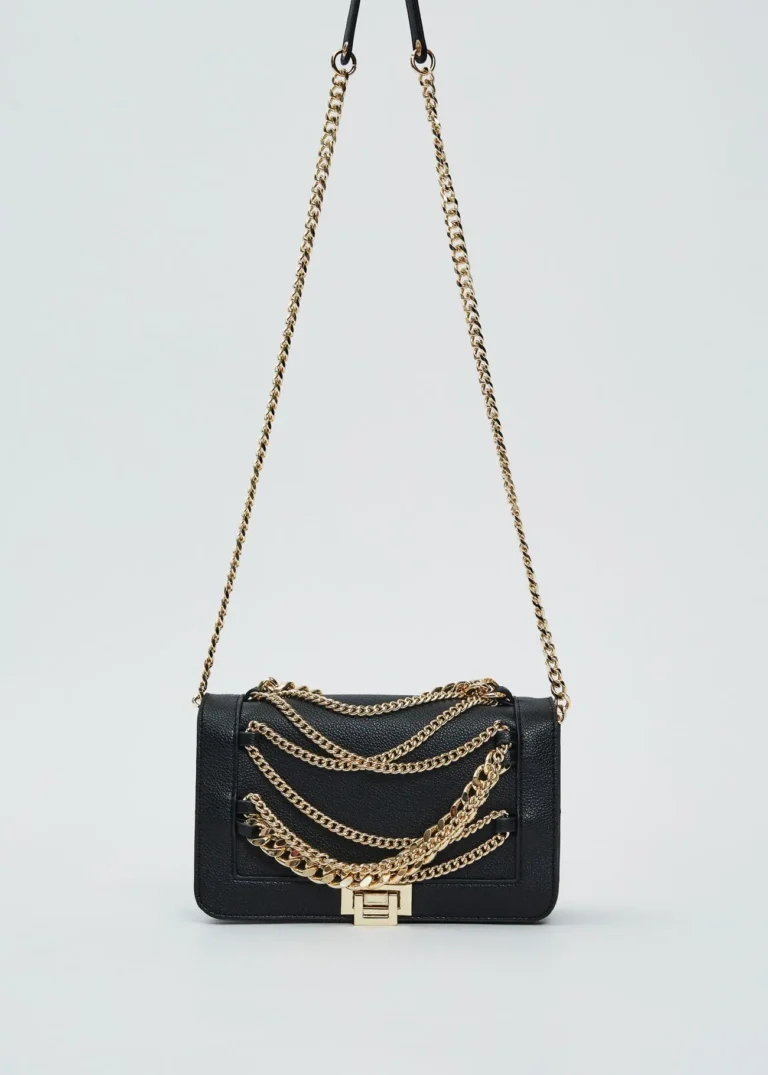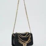 Bolso en material sintético con cadenas decorativas frontales y asa larga.