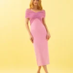 Vestido en tejido punto en tul drapeado con sobre cuerpo en hombros.