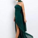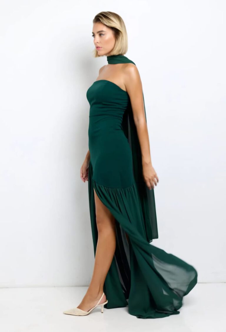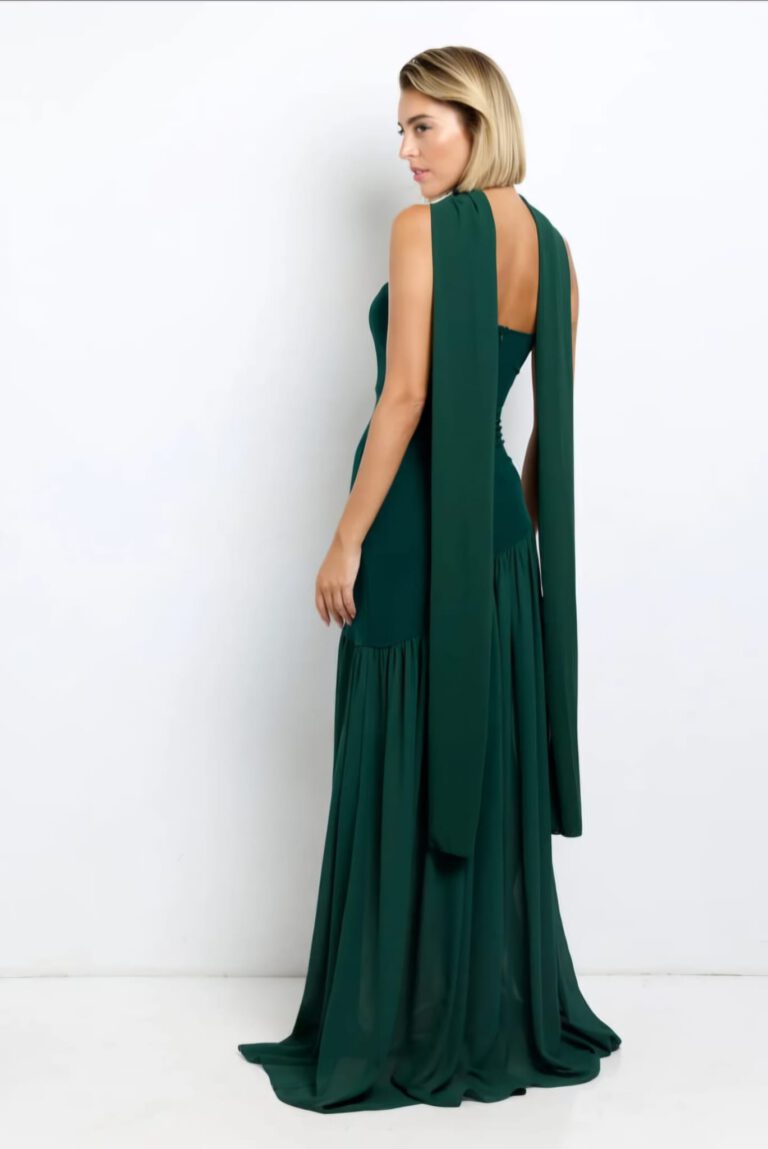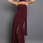 Vestido en tejido de punto frio con eslatan, drapeados en pecho y cintura y abertura lateral con sobre tela. Decoraciones en cristal en pecho y cintura.