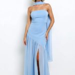 Vestido en tejido de tul con forro interior, drapeados en la cintura y zona trasera. Escote bardot, pecho con pliegues y cuerpo transparente con ballenas. Cierre con cremallera invisible trasera y cintas cruzadas en espalda.