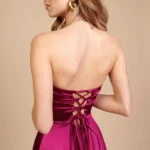 Vestido en tejido punto satinado con corte corsé y tiras en espalda para ajustar. Corte vuelo en falda.