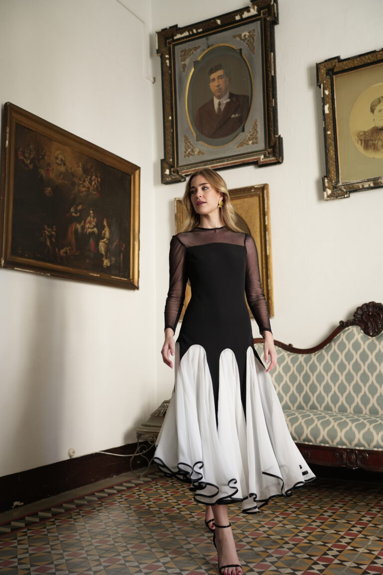 Vestido en tejido crepe con elastano en parte superior combinado con gasa en vuelo a contraste en parte inferior. Mangas en tul.