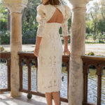 Vestido en tejido brocado con forro interior, mangas abullonadas y abertura en la espalda. Cierre con botones en el cuello y cremallera invisible.