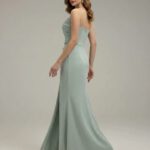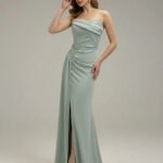Vestido en tejido de gasa con forro interior, pecho drapeado lateral con decoraciones en cristales, apertura lateral y cierre con cremallera invisible en la espalda.
