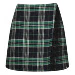 Minifalda en tejido paño en estampación cuadros con corte pareo y plumas decorativas frontales.