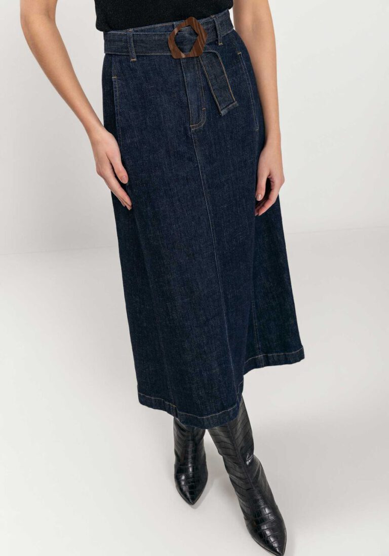 Falda en tejido algodón jeans con elastano con cinturilla alta y detalle de cinturón.