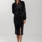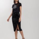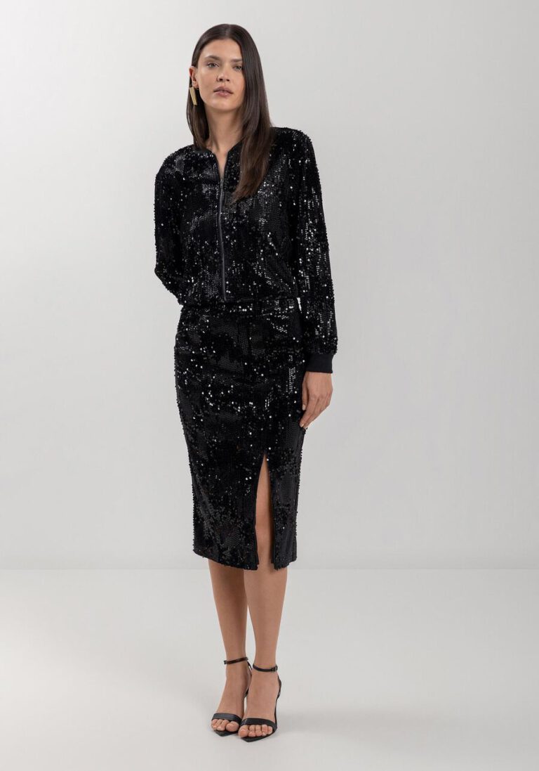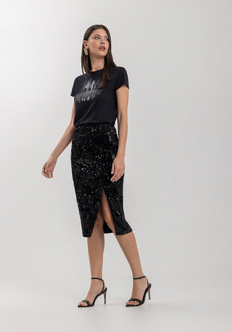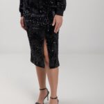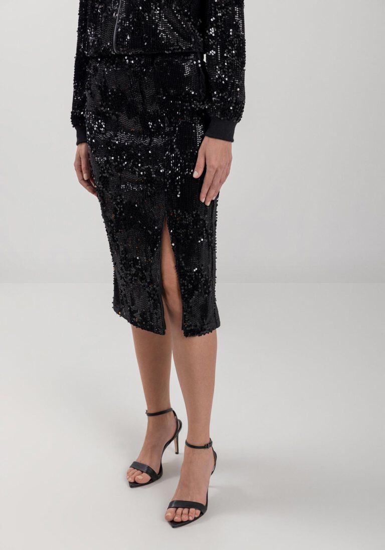 Falda en tejido terciopelo con lentejuelas y elastano. Abertura frontal.