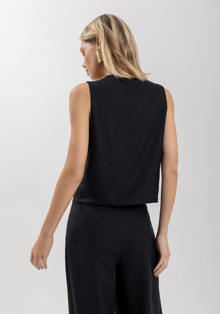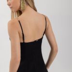 Top en tejido de crepe con detalle dorado en tirantes. Cierre con cremallera invisible en la espalda.