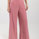 Pantalón en tejido satinad, pata ancha y cinturilla con cierre delantero.