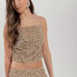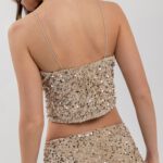 Top en tejido de terciopelo con paillette en tono dorado. Tirantes elásticos cola de ratón.