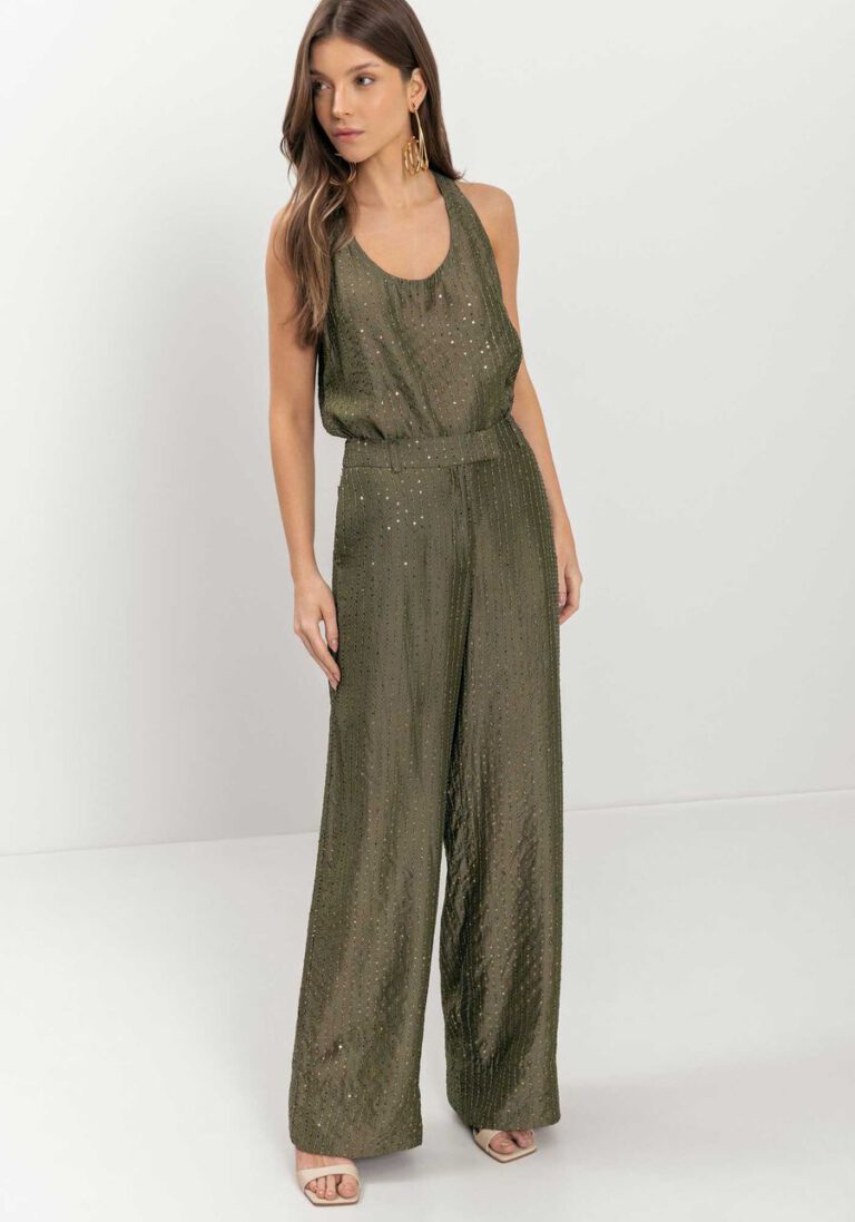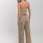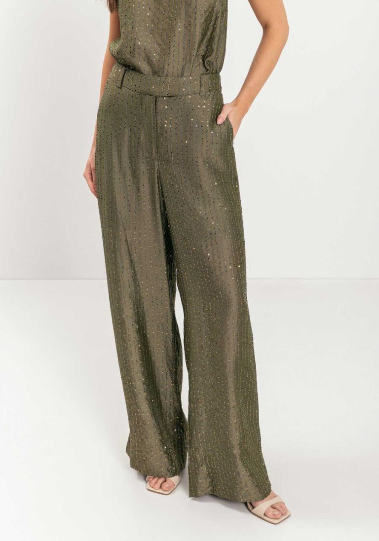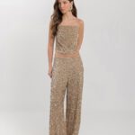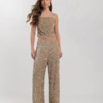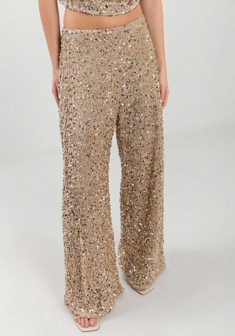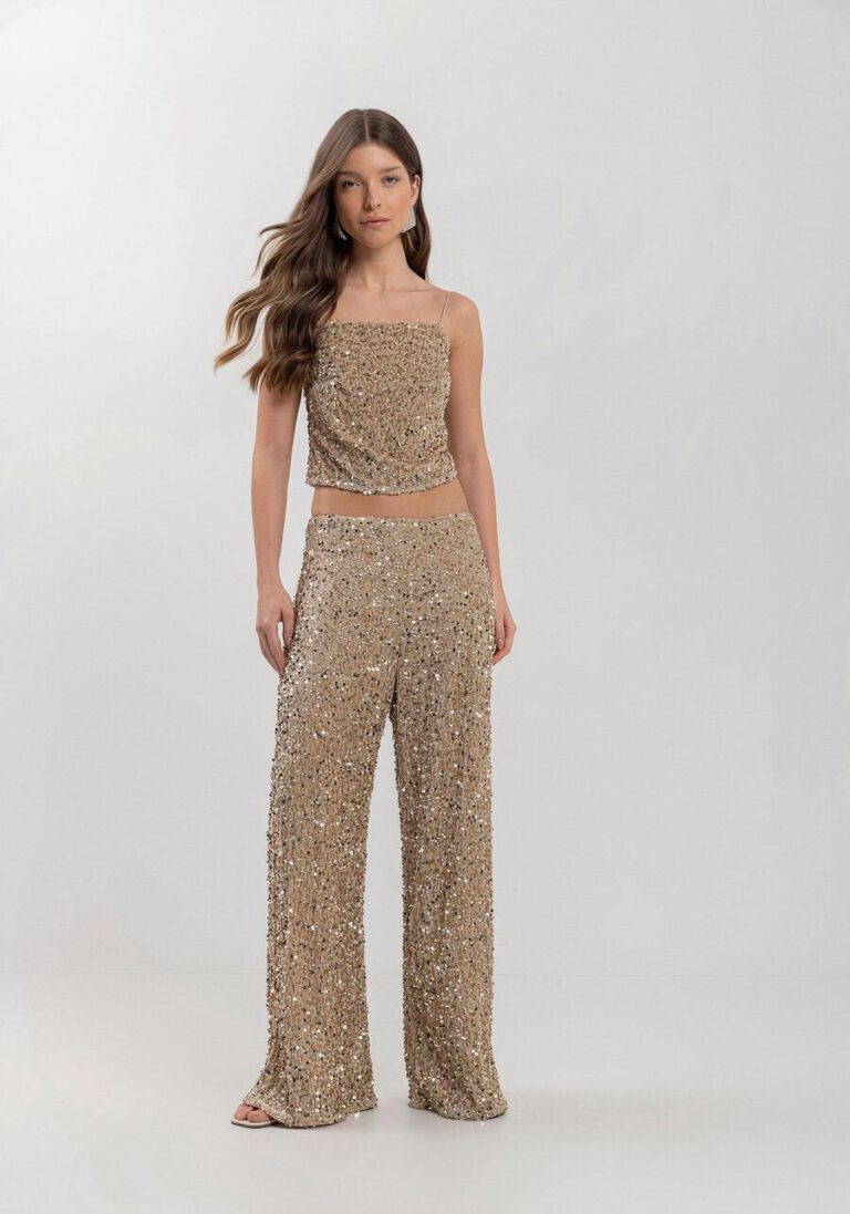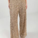 Pantalón en tejido de terciopelo con paillette en color dorado, corte en pata ancha. Cierre con cremallera invisible lateral.