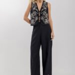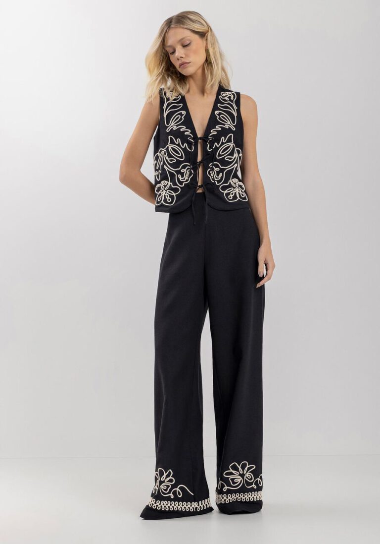 Chaleco en tejido algodón combinado con viscosa y modal con detalles bordados frontales y lazada para ajustar.
