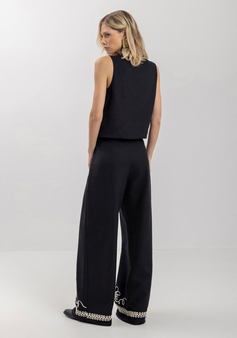 Pantalón en tejido 100% algodón con líneas decorativas y detalles en lentejuelas. Tejido sin elastano.
