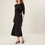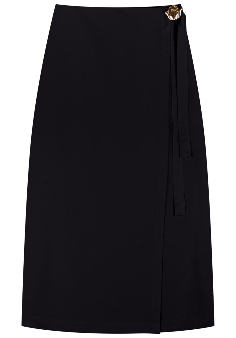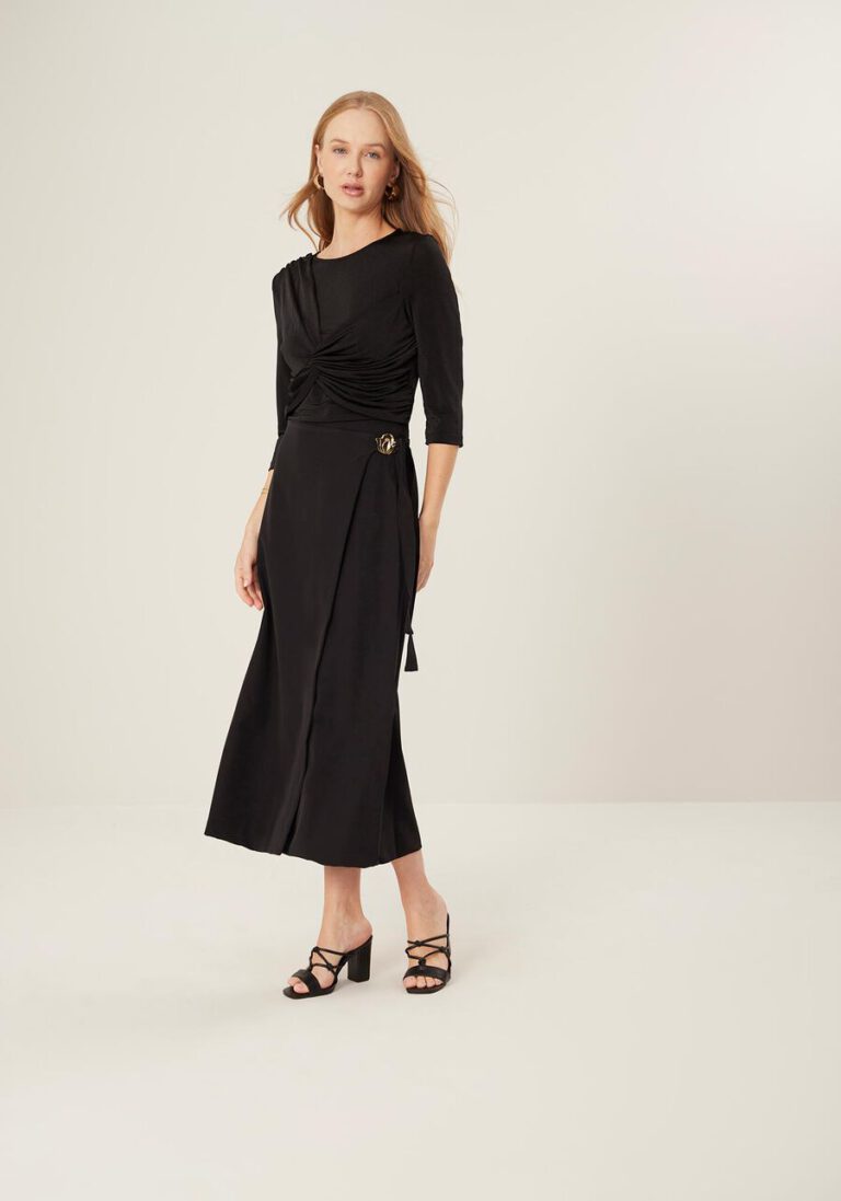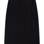 Falda en tejido crepe con elastano con corte pareo y detalle lateral dorado decorativo.