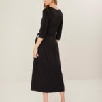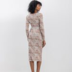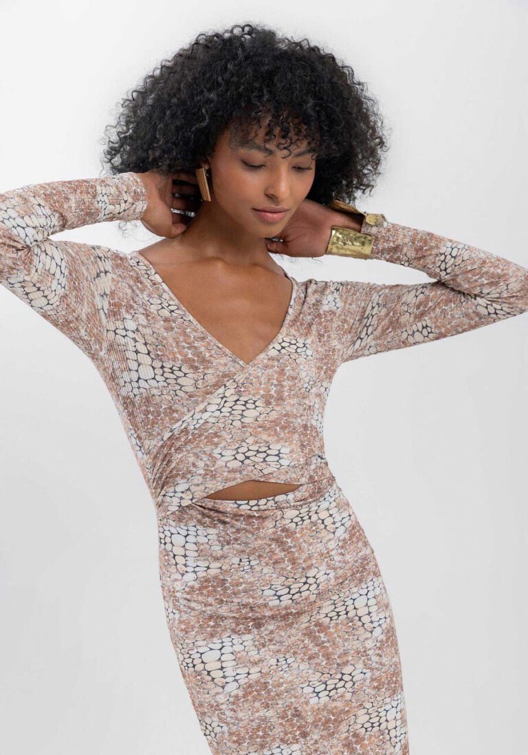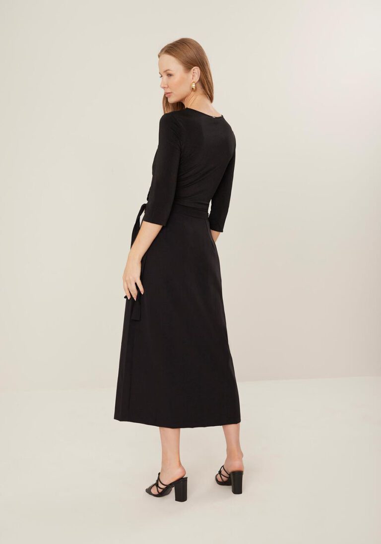 Vestido en tejido de punto canalé con escote cruzado y abertura en el centro.