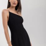 Vestido en tejido de crepe con apertura lateral. Corte asimétrico con detalle dorado en el tirante. Cierre con cremallera invisible en el lateral.