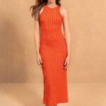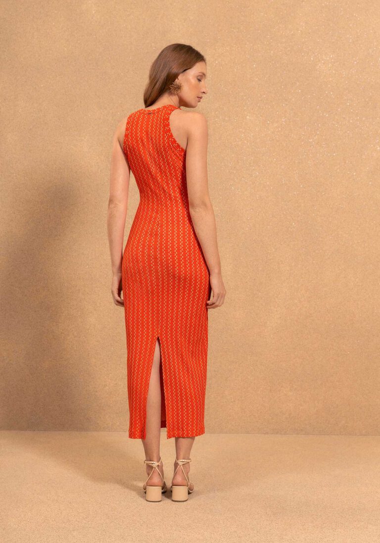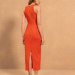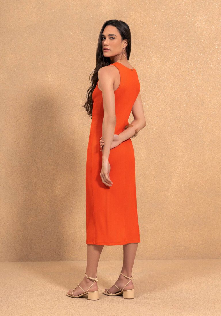 Vestido en tejido algodón en canalé con nudo frontal decorativo y abertura.