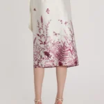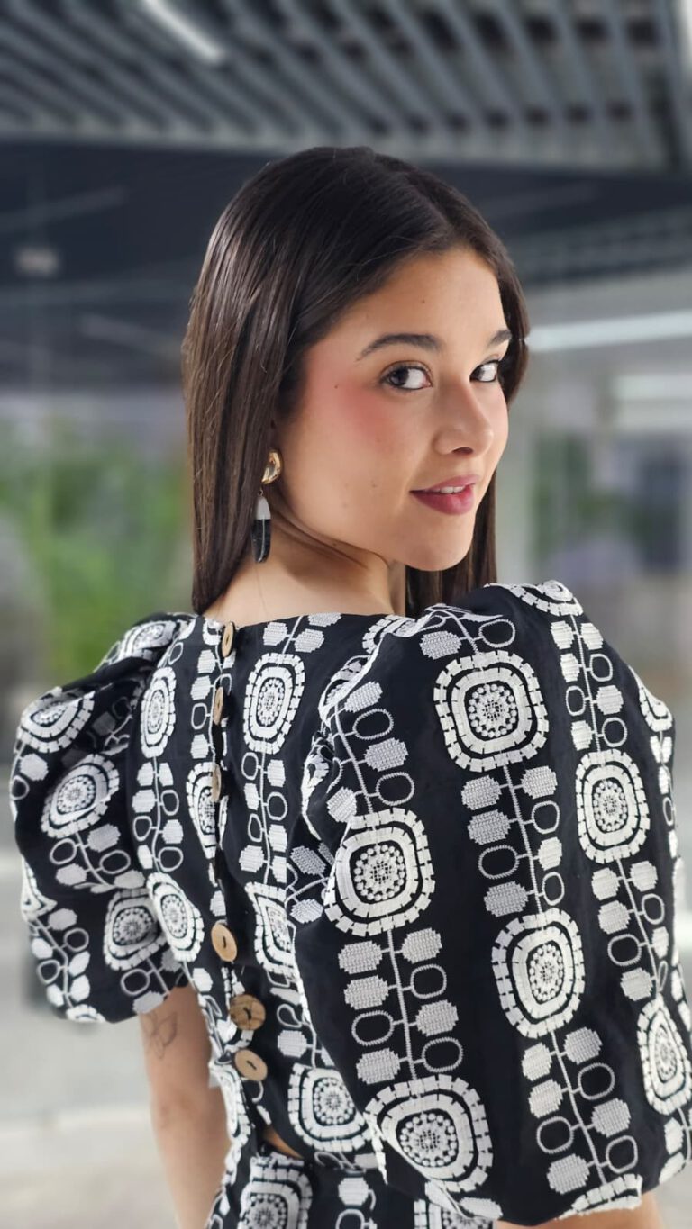 Conjunto en tejido algodón mezcla lino con bordados drapeados y botonadura vista en espalda. Tejido sin elastano.