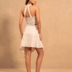 Conjunto en tejido seda salvaje con bordados, compuesto por top con cuello halter y lazada y falda con doble volante en evase. Tejido sin elastano.