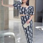 Conjunto en tejido crepe con elastano con top con manga volumen y corte crop y falda lápiz con abertura trasera.