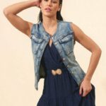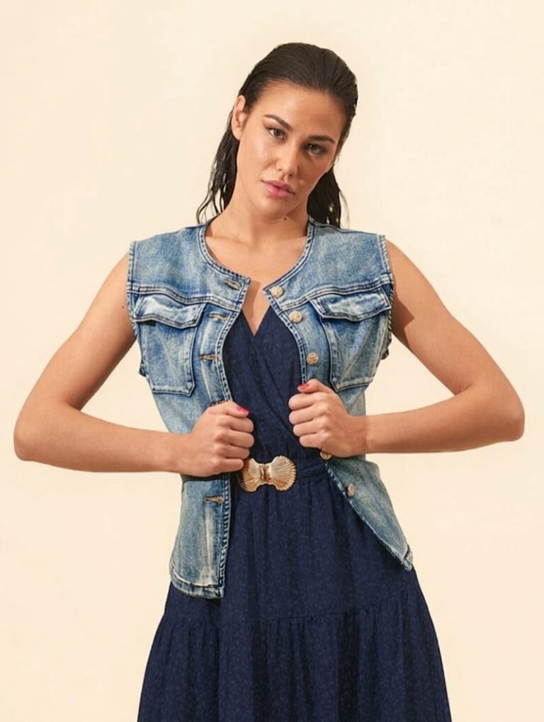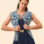 Chaleco en tejido vaquero con elastano, botones decorativos en dorado y cinturón metálico en color dorado.