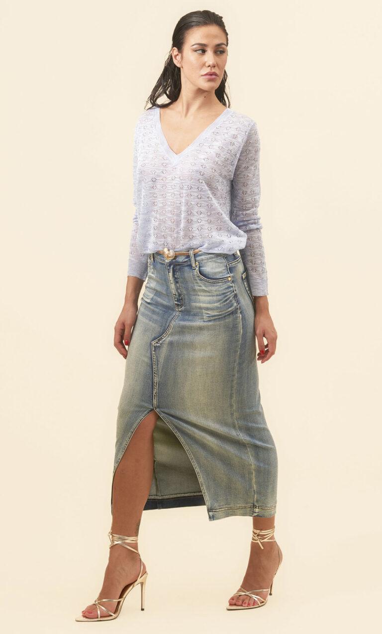 Falda en tejido algodón jeans con elastano con abertura frontal y cadena decorativa incluida.
