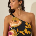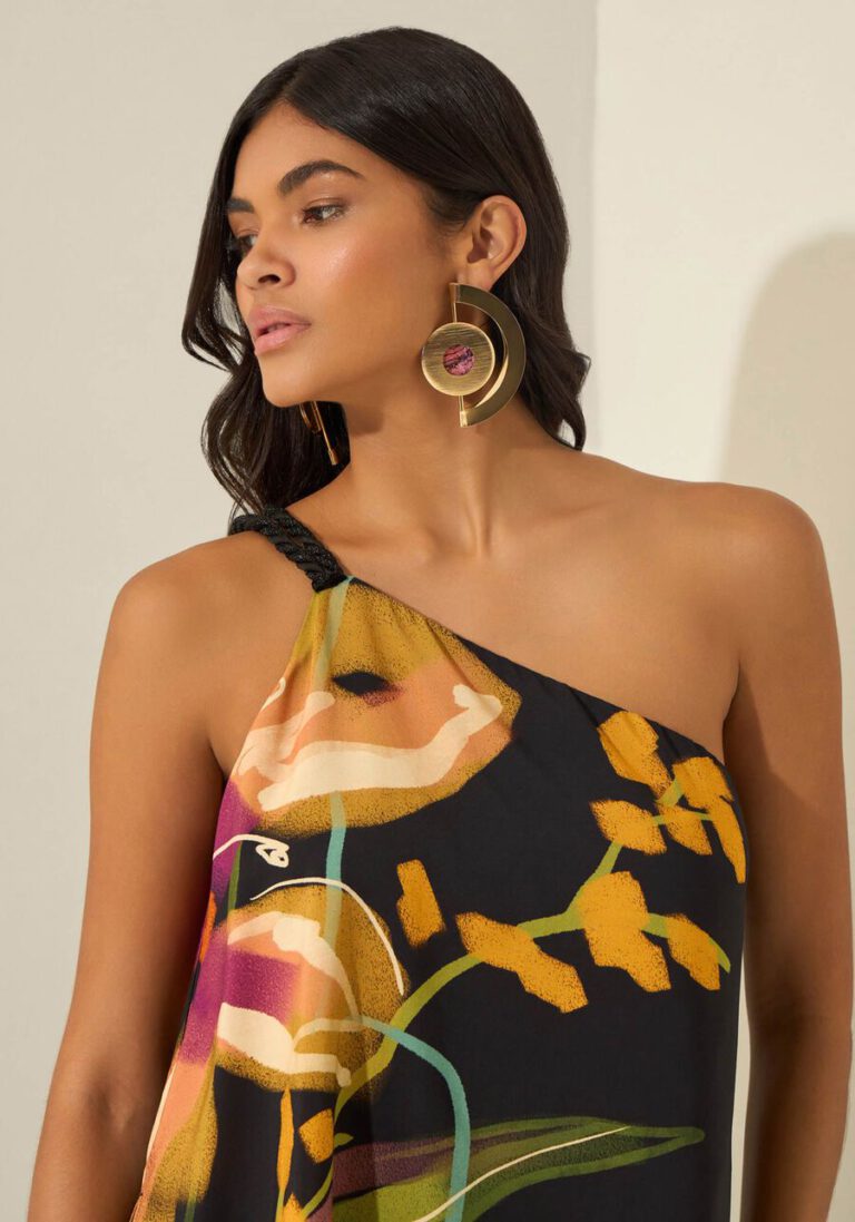 Vestido en tejido punto con simetría en hombro y detalles en broches en forma de flor.