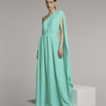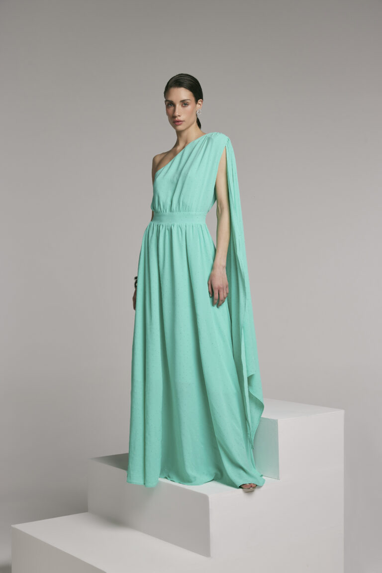 Vestido en tejido punto en tul drapeado con sobre cuerpo en hombros.