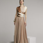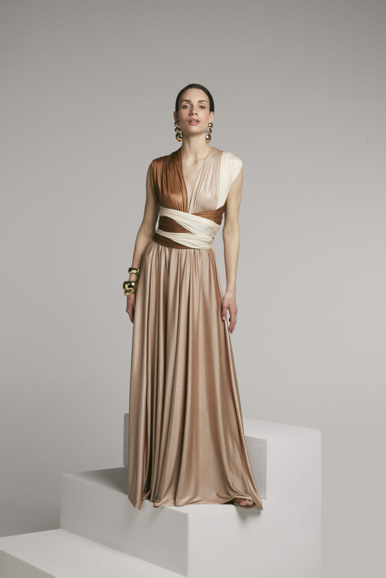 Vestido en tejido punto en seda con drapeado lateral y detalle dorado en cintura. Abertura frontal.