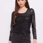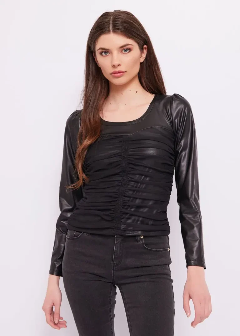 Camiseta en tejido ecopiel y tul drapeado delantero.