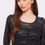 Camisa en tejido de ecopiel con fruncido central y cierre con botonadura central.