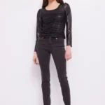 Chaqueta en tejido encaje con elastano combinado con jeans decorativo.
