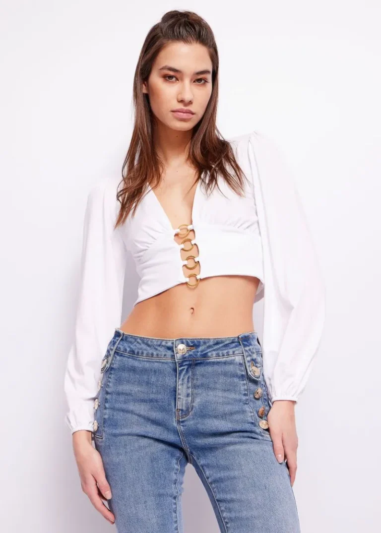 Blusa en tejido crepe con elastano con corte crop y botonadura vista.
