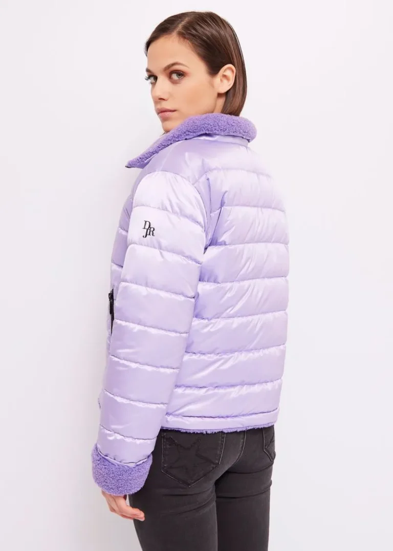 Chaquetón reversible con borreguito en un lado y por otro acolchado. Cierre con cremallera vista en color negro a contraste.