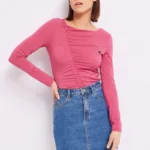 Camiseta en tejido de viscosa con elastano, anilla decorativa en la zona central, mangas anchas con rizo en el puño.
