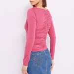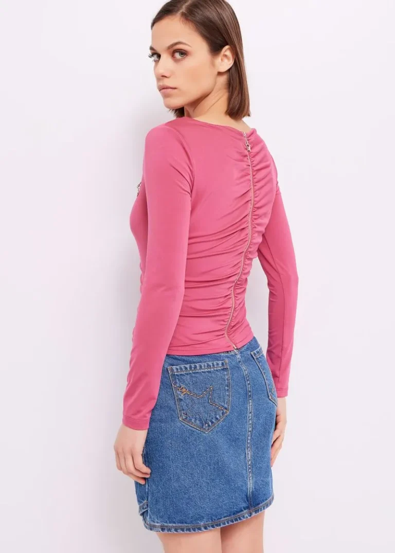 Camiseta en tejido punto con drapeados frontales y traseros. Cremallera vista.
