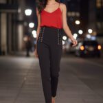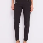 Pantalón en tejido crepe con elastano con cinturilla alta y botonadura vista lateral.
