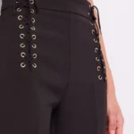 Pantalón en tejido crepe con elastano con tiro alto y cuerdas frontales decorativas.
