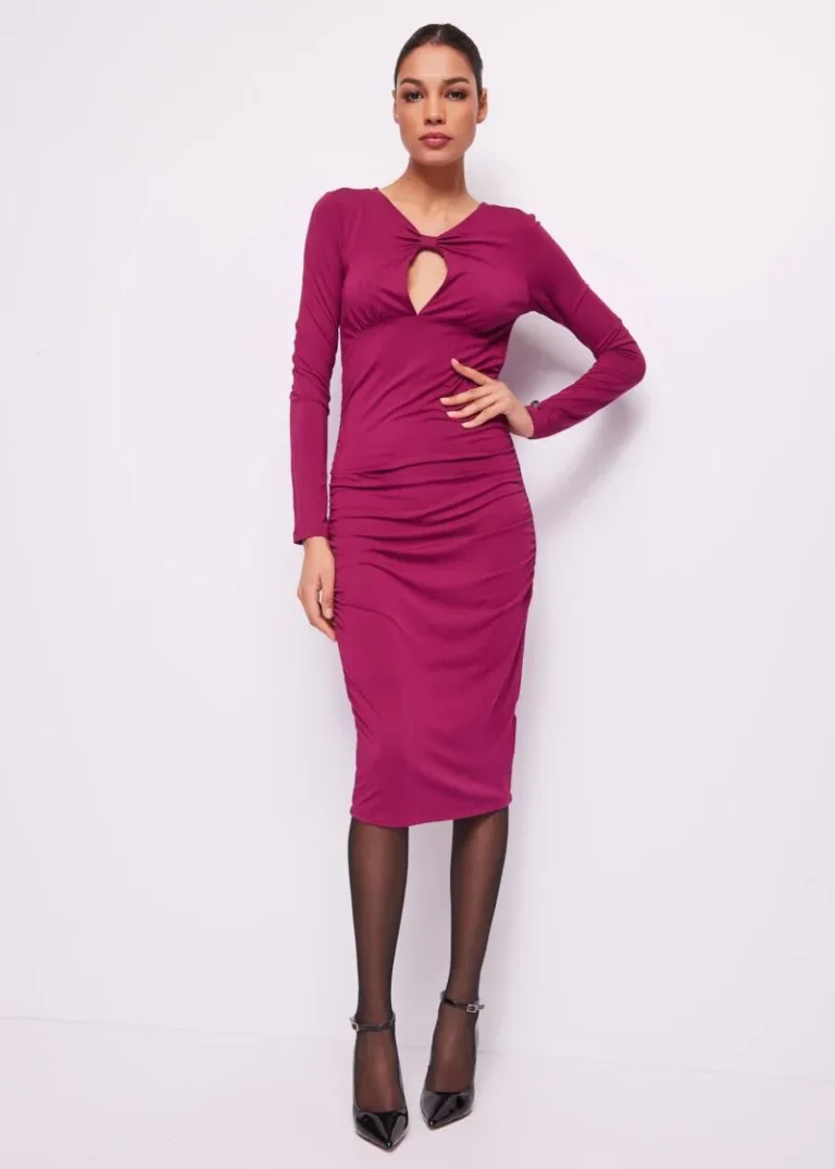 Vestido en tejido algodón con elastano con drapeados laterales y efecto moña decorativa frontal.