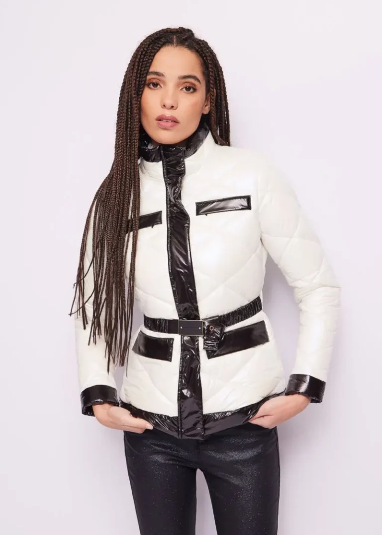 Chaquetón en material sintético con detalles metalizados en la tela y cinturón para ajustar a contraste.