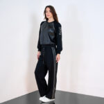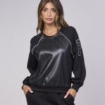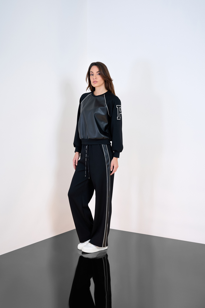 Felpa en tejido eco piel combinada con punto con detalles en vivos y letra en manga con cristales de imitación.